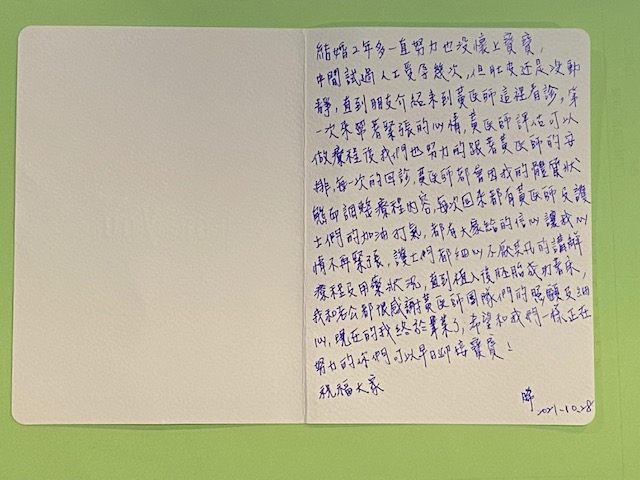 結婚兩年多一直努力也沒懷上寶寶,中間試過人工受孕幾次,但肚皮還是沒動靜,直到朋友介紹來到黃醫師這裡看診,第一次來帶著緊張的心情,黃醫師評估可以做療程後我們也努力的跟著黃醫師的安排,每一次的回診,黃醫師都會應我的體質狀態而調整療程內容,每次回來都有黃醫師及護理師們的加油打氣,都有大家給的信心讓我心情不再緊張,護士們都細心不厭其煩的講解療程及用藥狀況,直到植入後胚胎成功著床,我和老公都很感謝黃醫師團隊們的照顧及細心,現在的我終於畢業了,希望和我們一樣正在努力的你們可以早日迎接寶寶!祝福大家